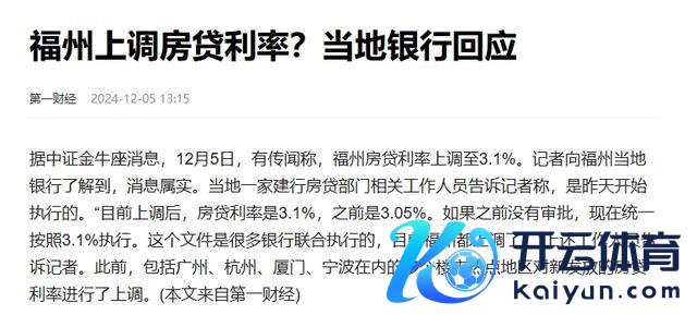 记者也去采访,证实讯息属实。举例福州市某银行东谈主员就称,这是在12月4日开启的新程序。“目下上调后房贷利率是3.1%,之前是3.05%。况兼这个文献是许多银行阿谀实施的。”记者从网上也了解到,包括广州、杭州、厦门、宁波在内的多个楼市热门地区对新披发的房贷利率进行了上调。