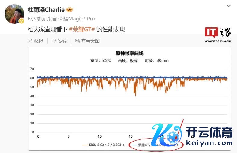 据IT之家此前报说念,荣耀 GT 系列居品司理 @杜雨泽Charlie 在本月(12 月 4 日)共享了新机帧率图。图片显现,荣耀 GT 手机将搭载骁龙 8 Gen3 料理器,CPU 主频为 3.3GHz。