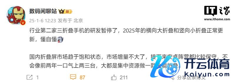 IT之家 1 月 6 日音书,博主 @数码闲话站 本日午间发文走漏,“行业第二家”三折叠手机的研发暂停了,2025 年的横向大折叠和竖向小折叠宽广更新。他以为,国内折叠屏市集趋于鼓胀景色,市集增量不大,接下来安卓阵营都比拟保守,不会像前两年联贯上两三台,多半是皆集资源作念一款万能折叠。