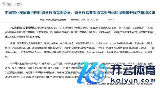 何泽蜀严重违抗党的政事秩序、清廉秩序、服务秩序,组成严重职务监犯并涉嫌纳贿坐法,且在党的十八大后不不断、不收手,性质严重,影响恶劣,应予严肃贬责。依据《中国共产党秩序贬责条例》《中华东说念主民共和国监察法》《中华东说念主民共和国公职东说念主员政务贬责法》等联系法例,经中国农业发展银行党委商榷,决定赐与何泽蜀开除党籍贬责;经中央纪委国度监委驻中国农业发展银行纪检监察组商榷,决定赐与何泽蜀开除公职贬责;收缴其非法监犯所得。四川省眉山市监委将其涉嫌职务坐法问题移送捕快机关照章审查告状,所涉财物一并移送。